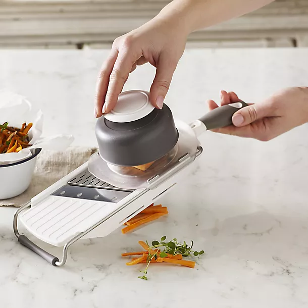 For a handheld mandoline, this model is incredibly versatile. You can safely and easily switch between three cutting thicknesses and three julienne settings without having to touch the stainless steel blades, while the special safety guard latches on to the device so it won’t ever slide off. With a soft-grip handle and non-slip feet, it can be used on a countertop or over a bowl.