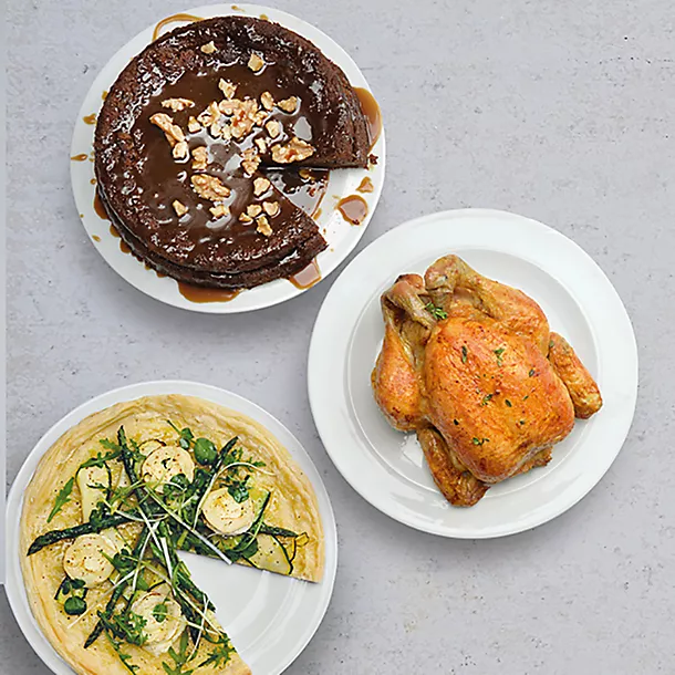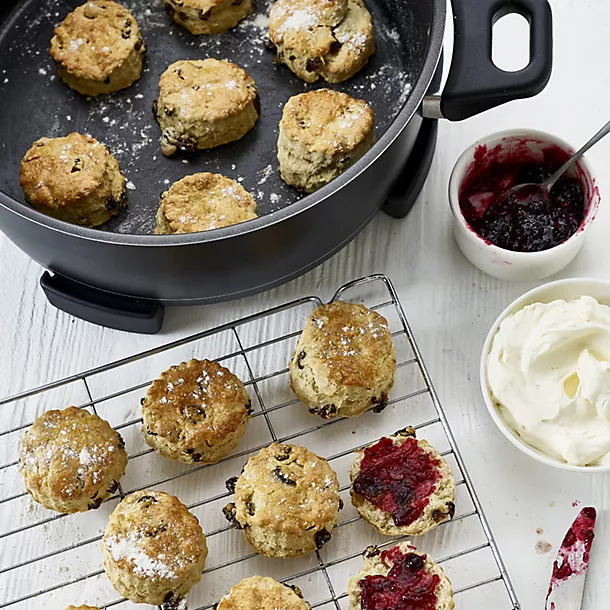 Although it looks like a pan, it can cook like an oven, if not better, and uses very little electricity. Roast chicken pieces (crispy skin, flesh as soft as butter), succulent lamb chops with golden roasted potatoes, toad-in-the hole and fish bake, toasted sandwiches, baked potatoes, pizzas from frozen, ready meals in their foil dishes; you can even bake light, moist sponge cakes and delicious scones. And it’s great for a low-fat fry-up too.