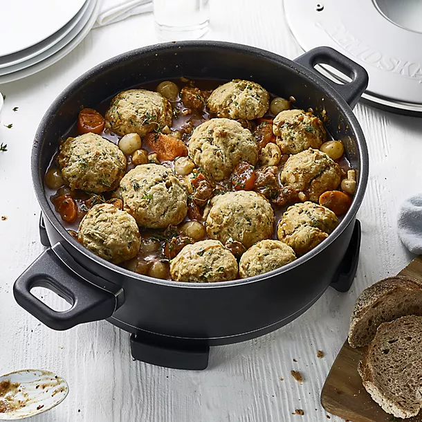 Small enough to sit in the corner of your caravan or holiday apartment but big enough to make a batch of perfectly roasted potatoes, a filling stew with a crispy potato topping or even bake a cake for a hungry family, the 4 Litre Grand Remoska may look like a pan, but it’s actually a mini oven.