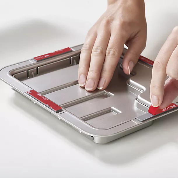 Ideal for mounting in narrow spaces, and with no need for any tools, the DoorStore rack is backed with immensely strong VHB adhesive tape from the sticky-stuff experts at 3M. Just find a smooth, clean surface, peel the backing tape off the adhesive panels and press the rack firmly into place… Instantly you have a bespoke knife block that will protect the blades from being chipped by other utensils and keep fingers safe when the family are rummaging to find things in your kitchen drawers.