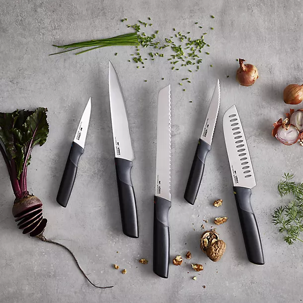 Each knife handle has a coloured collar and tip to help you find the right blade for a job when you’re in a hurry – so whether you’re selecting one from a drawer or storing them in a knife block, you can be sure you’re choosing the right one for the task in hand, and the colours coordinate with other sets in the Joseph Joseph Elevate and Nest ranges too.