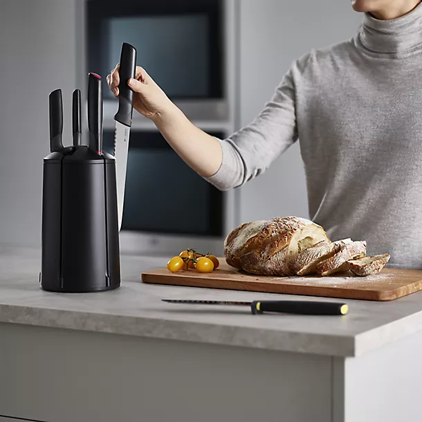 The smart rotating knife block is really sturdy with a non-slip base and magnetic knife slots that keep the knives securely in place. The clever design means that any Elevate knife can be stored in any of the slots, regardless of blade length.