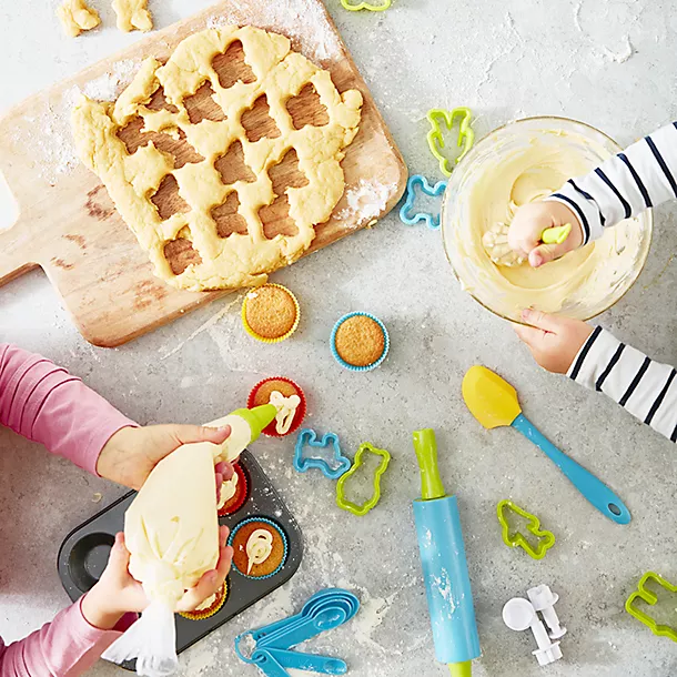 Our bakeware buyer Veronica knows that children love to bake, so she set out to find a kit that looks bright and fun, but can be used for proper baking sessions. Made from non-stick coated carbon steel or silicone, all of the tins, moulds and cake cases are heat-resistant to 220°C, and are suitable for ‘real’ baking – everything’s just been thoughtfully made for mini chefs, and even the plastic cookie cutters have smooth, child-friendly edges.