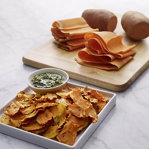 With adaptors to help you carve hard and soft vegetables alike, this clever gizmo can create sheets from potatoes, carrots, courgettes and even butternut squash, as well as from apples and pears – so you can create veggie pasta sheets for sweet and savoury dishes, or layer up large terrines in straight-sided dishes and top hotpots and stews in a sophisticated, geometric style.