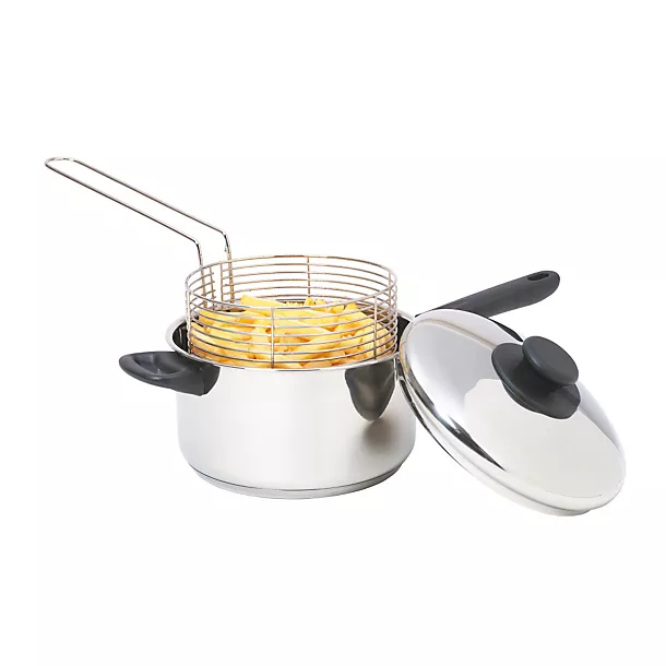 Featuring a 3mm thick base for even heating and a vented lid to let off steam, it also comes with a long handle for lifting the pan away from the heat safely, letting you get those chunky chips from the fryer to your plate quickly and easily.