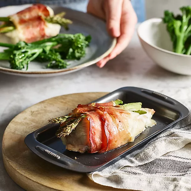 It’s practical improvements, like handy fill lines, making same-shaped pieces stack and adding pouring noses to our roasters, that makes our range outshine most others. We’ve also given our tins’ exteriors a lovely pearlescent finish so they look really special too. Because why shouldn’t your ovenware look as good as your roasts and bakes do?