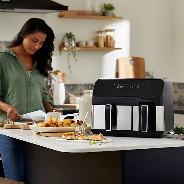 While most air fryers have just one basket for cooking one thing at a time, this clever machine has both a 5 litre basket and a 3 litre basket for cooking two different foods at once, so you can use it in place of your oven, rather than as just another kitchen helper. Depending on when you want each dish to be ready, you can either choose separate times for when you want your food to finish cooking, or you can set both baskets individually to finish cooking at the same time, so that both dishes are piping hot and ready to serve together. Fish without the chips, anyone? We didn’t think so!