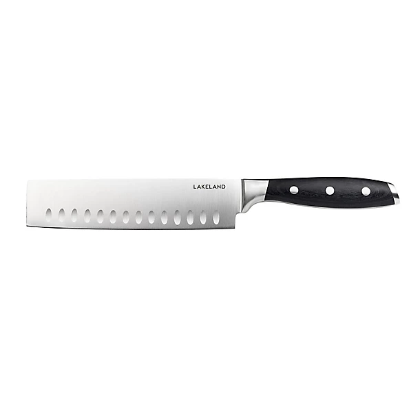 It might look like a meat cleaver, with its straight, symmetrical edge and thin, wide blade, but a nakiri knife is traditionally used to precisely and finely slice, dice and chop vegetables and herbs. Rather than a rocking motion, a nakiri blade encourages an up and down cutting technique, while the scalloped indents prevent food sticking to help speed up chopping.
