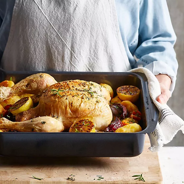 This superb quality roasting tin will not only cook your Sunday joint to perfection – and the vegetables to go with it – but also offers even cooking, superior food release and can go in the dishwasher for easy clean-up.