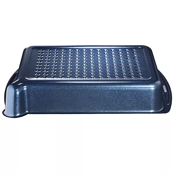 Oven safe up to 240°C, it has a textured base so that air can circulate around your food to ensure even, crisp cooking, and the handy corner ‘nose’ is perfect for pouring away excess fat or collecting the juices to form the base of a delicious gravy. Sure-grip handles with silicone inserts make it easy to get in and out of the oven, and if you have more than one, they can be stacked for space-saving storage.