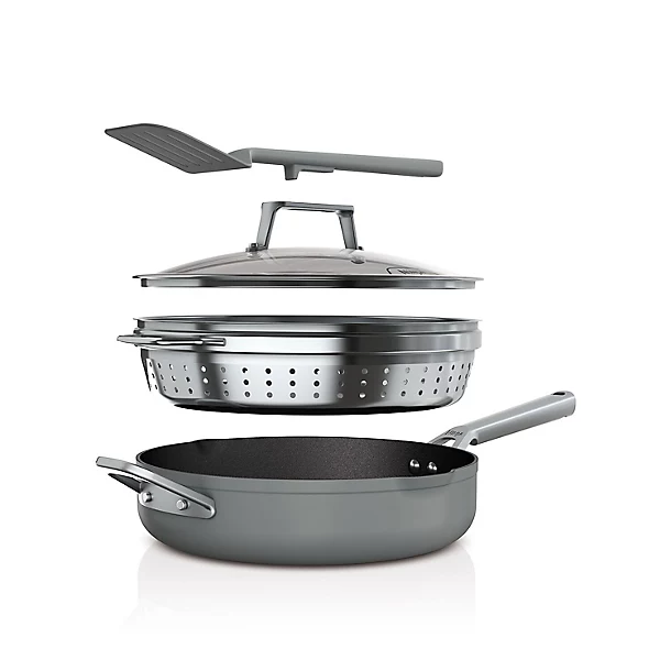 There’s also an integrated stainless-steel steamer for making delicious dim-sum and vibrant veggies, which doubles up as a strainer for quickly draining pasta and potatoes. And not forgetting the heat-tempered glass lid, which features an integrated spatula to make serving your creations even easier.