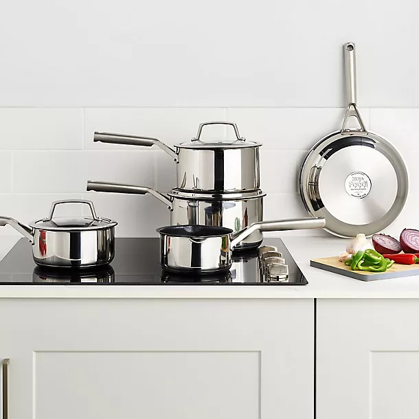 Each pan in this elegant five-piece set has been crafted with polished stainless-steel and an aluminium core which provides the most even heat distribution – so you can rely on them to cook consistently, every time.