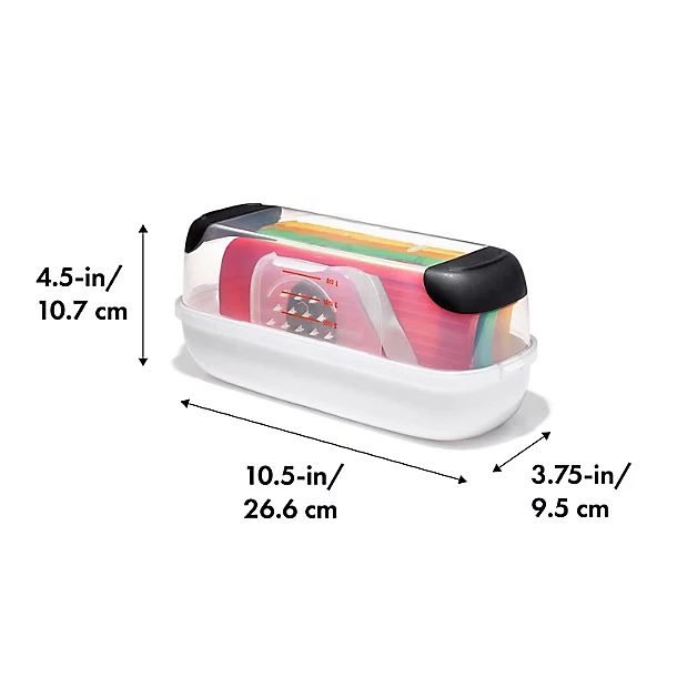 Want to make veggie noodles? Evenly sliced tomatoes? Grated Cheddar, Parmesan, or shavings of chocolate? You don’t need lots of different kit – OXO Good Grips’ Spiralize, Grate and Slice Set will do it all.