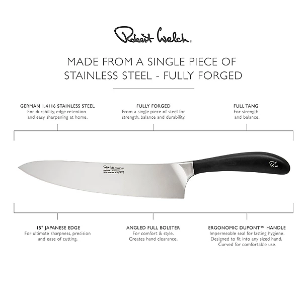 Developed with professional chefs, and combining their eye for sleek, stylish design with usability, the Robert Welch Signature Knife Range is perfect for any kitchen, from professional chef to aspiring home cook.