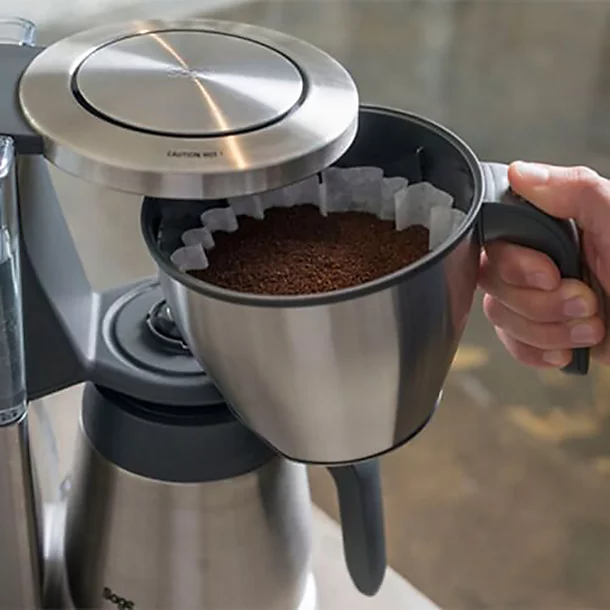 There’s an Auto Start button that lets you choose when to start brewing in advance, a Child-Lock safety feature and an adjustable standby setting so you can select how quickly your machine enters standby mode after use. To help extract the optimum flavour from your blend, there’s the option of using a cone-shaped filter when brewing 2-8 cups, and either the mesh basket filter or the flat bottom brew basket with a paper filter when brewing more than 8 cups. Because the hardness of your water can affect the taste of your brew, there’s an adjustable water hardness setting – just use the included test strip to select the right level – and the dual-walled, brushed stainless steel carafe keeps your coffee hot for longer once it’s brewed.
