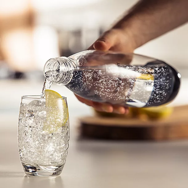 To start enjoying bubbles at home whenever you want, simply fit the included 60-litre gas cylinder into the back of the drinks maker. Then fill the carbonation bottle with cold water, put it in the drinks maker, and then close and lock the lid into position with the lever at the front. Once you’re set up, just press the button on the top to begin carbonation – three times for one second to make standard sparkling drinks, and up to a maximum of five times for drinks with a bit more fizz.