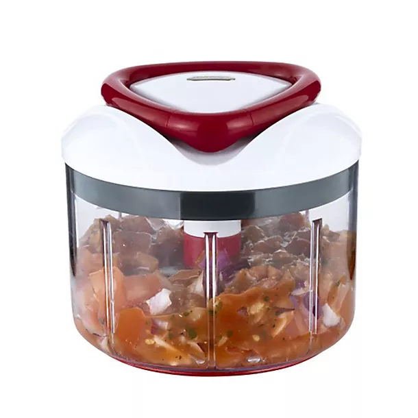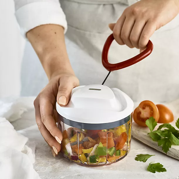 Easily chopping, mixing, puréeing or blending fruit, nuts, herbs and more using a manual pull-cord system that works like a spinning top, the Zyliss Easy Pull Manual Food Processor effortlessly creates results as precise as an electric chopper, but without the electricity.